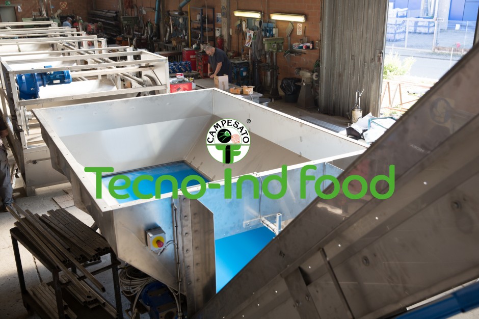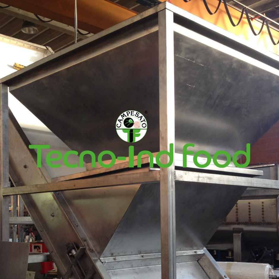 Tramoggia di carico con nastro elevatore, nastro con tramoggia, ricevimento a nastro, bunker , nastro convogliatore, polmone di accumulo, campesato macchine agroalimentari,hoppers, wet hopper, creep feed hopper, bunker